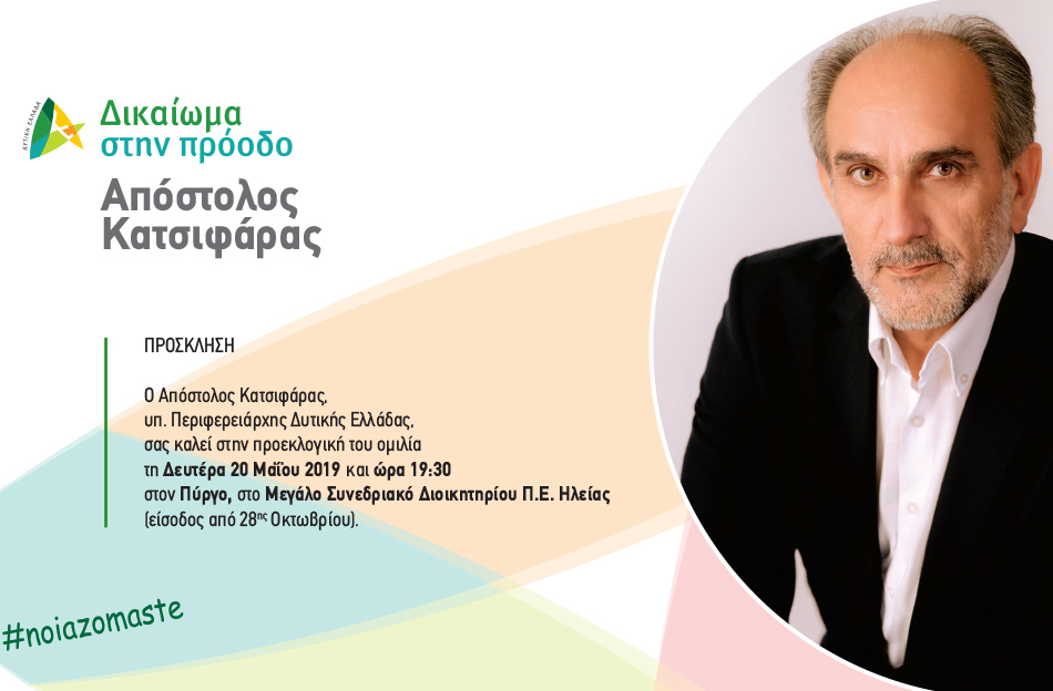 Στις 7.30 το απόγευμα της ερχόμενης Δευτέρας 20 Μαΐου 2019 ο Περιφερειάρχης Δυτικής Ελλάδας και επικεφαλής του συνδυασμού «Δυτική Ελλάδα-Δικαίωμα στην Πρόοδο» Απόστολος Κατσιφάρας θα μιλήσει σε ανοικτή προεκλογική συγκέντρωση που θα φιλοξενηθεί στο Μεγάλο Συνεδριακό στο Διοικητήριο της Π.Ε Ηλείας στον Πύργο (είσοδος από 28ης Οκτωβρίου).
