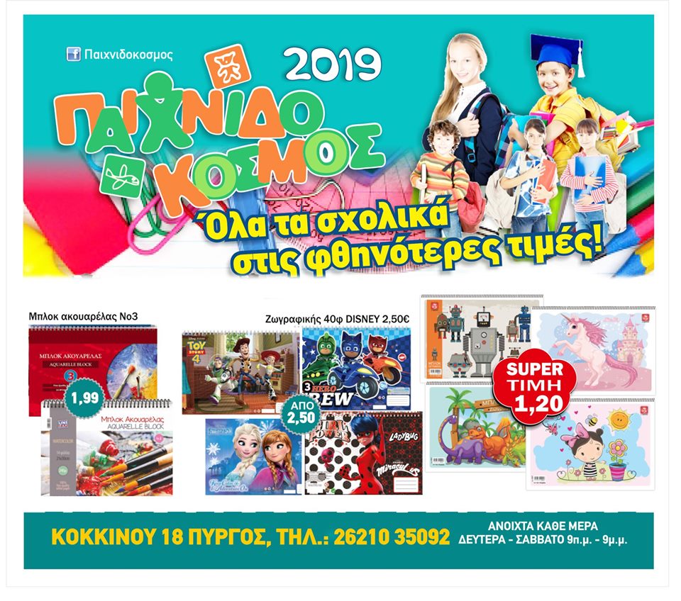 Τετράδια, μολύβια, παγουρίνια, τσάντες, κασετίνες, γόμες, χαρτόνια και μεγάλη ποικιλία σε σχολικά και χαρτικά είδη σε περιμένουν στο κατάστημα “Παιχνιδόκοσμος” στον Πύργο. Οικονομικές επιλογές που σίγουρα σας αφήσουν ικανοποιήμενους.