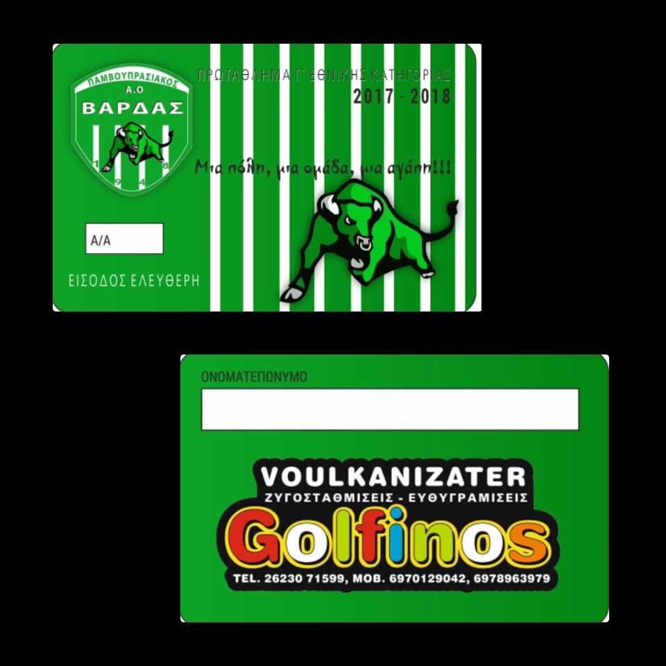 Ο κάτοχος της κάρτας θα έχει τη δυνατότητα να παρακολουθήσει όλους τους εντός έδρας αγώνες του ΠΑΜΒΟΥΠΡΑΣΙΑΚΟΥ του Πρωταθλήματος της Γ’ Εθνικής στο γήπεδο “Γρ. Καλάκος” της Βάρδας.