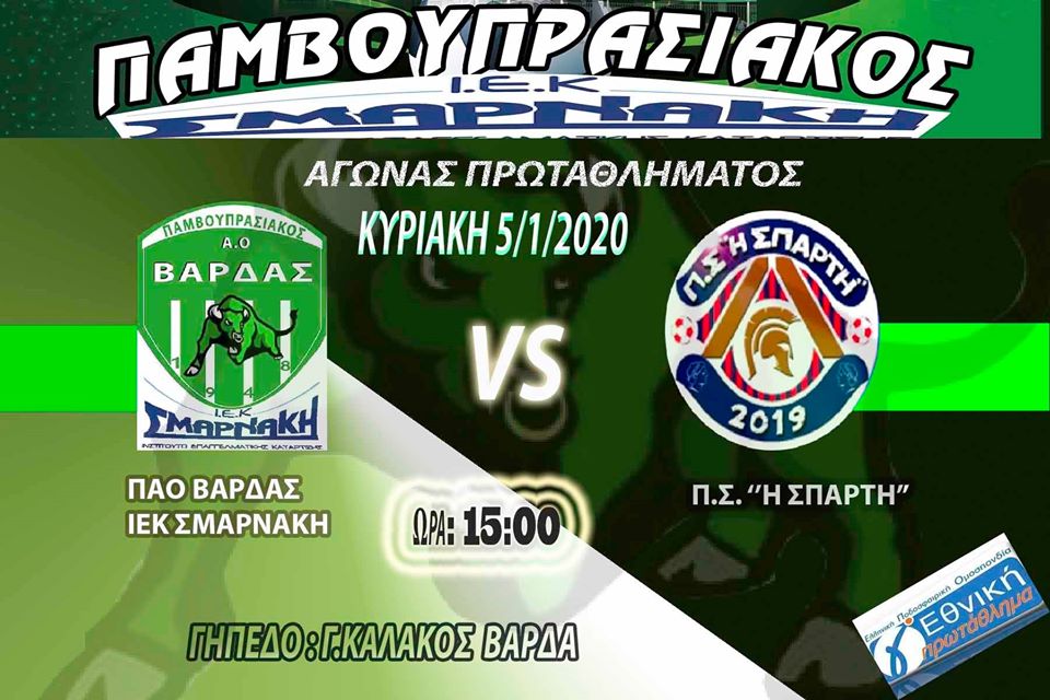 Για την 14η αγωνιστική ημέρα και πρώτη του β’ γύρου, του πρωταθλήματος της νέας Γ’ Εθνικής (Τέταρτης Κατηγορίας πλέον) στον 7ο όμιλο, ο Παμβουπρασιακός υποδεχόμενος στη Βάρδα τη διεκδικήτρια του τίτλου στον όμιλο, Σπάρτη, αναδείχτηκε μαζί της ισόπαλος με 1-1 σκορ.