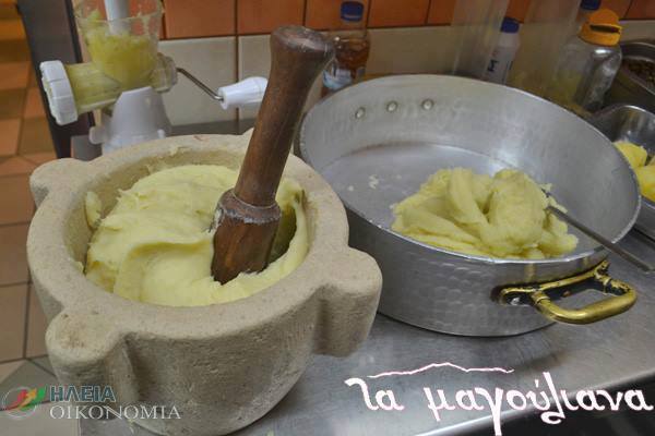 – Κοσμά μου δεν έχει δοκιμάσει απο το Οινομαγειρίο Τα Μαγούλιανα στην Αμαλιάδα, γι’αυτό το λες. Εκεί οι ετοιμασίες έχουν ξεκινήσει απο την προηγούμενη μέρα. Βράζουν τις ντόπιες πατάτες, τις καθαρίζουν και αφού τις περάσουν απο τον μύλο τότε ξεκινάει και το παραδοσιακό χτύπημα στο γουδί! Συνοδεία βακαλάου ξαλμυρισμένου, σίγουρα θα θες να πάρουμε και για το σπίτι… Κοσμά, Κοσμά που είσαι;;