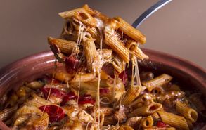 - Σε ένα πυρίμαχο σκεύος βάζουμε μία στρώση με τις μισές πένες και πασπαλίζουμε, από πάνω, με το μισό από το κάθε τυρί μας. Επαναλαμβάνουμε ακόμη μία φορά.