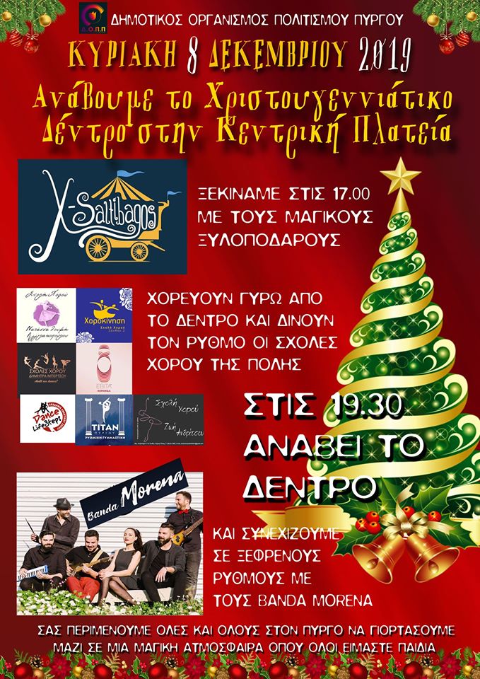 Οι X-Saltibagos,οι ξυλοπόδαροι, θα είναι μαζί με τα παιδιά για να κάνουν τα μαγικά τους,οι σχολές χορού Χοροκίνηση Πόπης Παναγοπούλου, κλασσικού και σύγχρονου χορού Νατάσας Ζούμη Αγγελακοπούλου, Shallwedance σχολή χορού Δήμητρας Μπέρτσου, μπαλέτου και σύγχρονου χορού Εβίτας Κεραμιδά, Σωματείο ρυθμικής και αθλητικού χορού Σβετλάνα-Φωτεινής Λαινοπούλου, Σχολή χορού Ζωής Ανδρίτσου, Ακαδημία αθλητικού χορού Dancelife steps Μαρίας Πολίτη, συμμετέχουν χορεύoντας γύρω από το δέντρο και δίνουν ρυθμό στην γιορτινή ατμόσφαιρα των Χριστουγέννων μαθητές από τις σχολές χορού της πόλης μας,ενώ αμέσως μετά ανάβει το Δέντρο στις 7.30 μέσα σε μουσικές και πυροτεχνήματα και φαναράκια που φεύγουν στον ουρανό ενώ την σκυτάλη παίρνουν τα παιδιά της Banda Morena για να τραγουδήσουμε μαζί τους σε ξέφρενους ρυθμούς!”.