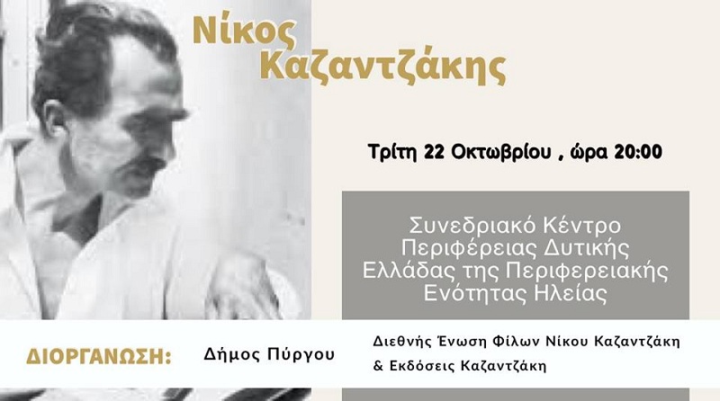Ο Δήμος Πύργου, η Διεθνής Ένωση φίλων Νίκου Καζαντζάκη και οι Εκδόσεις Καζαντζάκη , σας προσκαλούν στην λαμπερή εσπερίδα, που συνδιοργανώνουν ,αφιερωμένη στον μεγάλο φιλόσοφο Συγγραφέα , ποιητή και στοχαστή ,η οποία θα λάβει χώρα στο Συνεδριακό κέντρο της Περιφερειακής Ενότητας Ηλείας, την 22η Οκτωβρίου 2019 και ώρα 20:00μμ.