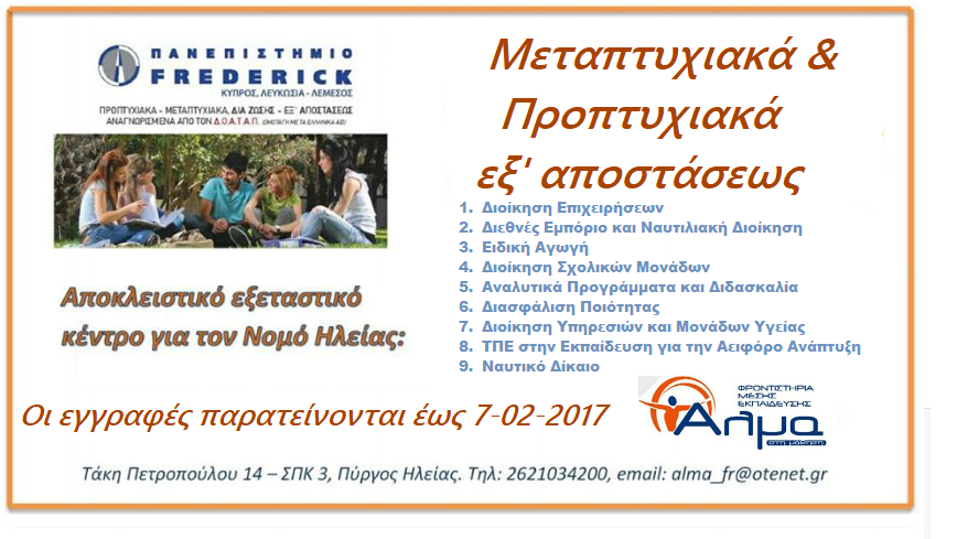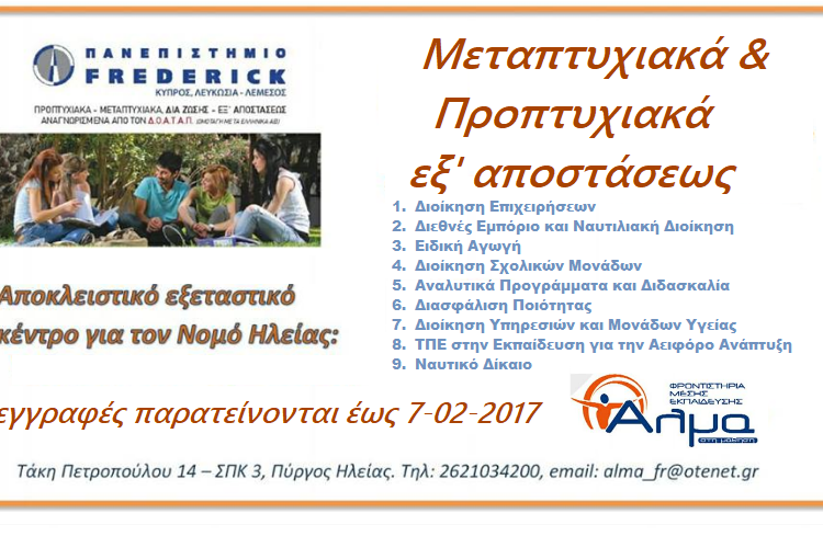 Την δυνατότητα πραγματοποίησης αναγνωρισμένων μεταπτυχιακών και προπτυχιακών εξ’αποστάσεων απο τον Πύργο δίνει το Φροντιστήριο Μέσης Εκπαίδευσης “ΆΛΜΑ” σε συνεργασία με το Πανεπιστήμιο FREDERICK.