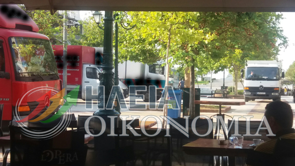 Φορτηγά ξεφορτώνουν εμπορεύματα και το κυκλοφοριακό κομφούζιο στην πλατεία δεν έχει όριο. Μποτιλιάρισμα φορτηγών…