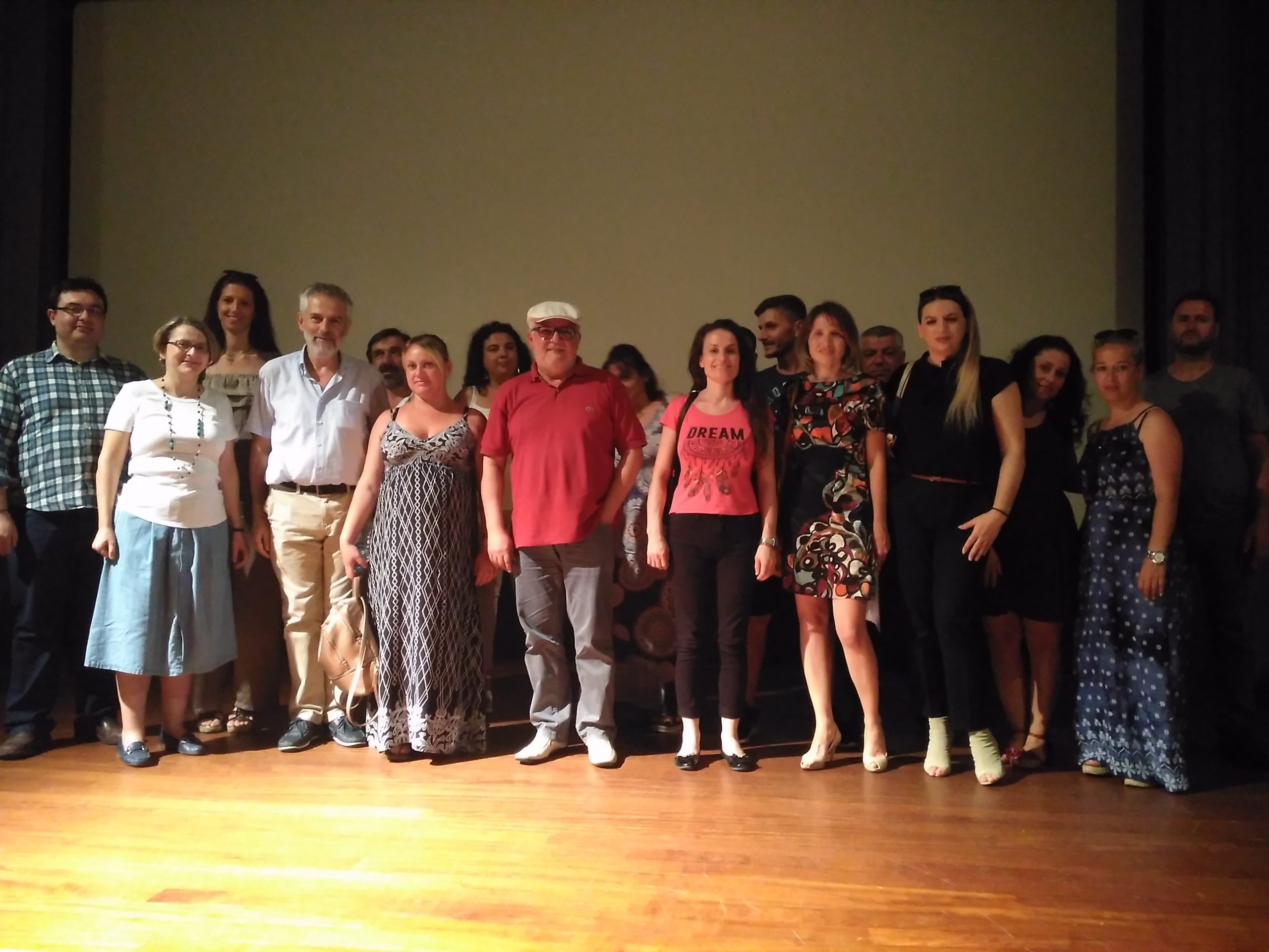 Εκπαιδευόμενες κι εκπαιδευόμενοι, εκπαιδεύτριες κι εκπαιδευτές με το Χρήστο Κωνσταντόπουλο, στη σκηνή του Θεάτρου Απόλλων, μετά την παρακολούθηση του έργου «Ο Ψύλλος»