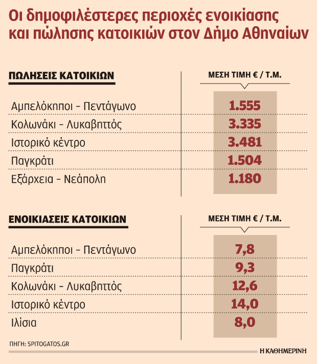 Σε πρωτοφανή επίπεδα έχουν αναρριχηθεί πλέον οι ζητούμενες τιμές ενοικίασης και πώλησης κατοικιών στο ιστορικό κέντρο της Αθήνας, ενώ σε πολλές περιπτώσεις έχουν συμπαρασύρει προς τα πάνω και άλλες συνοικίες του κέντρου. Πρόκειται για σαφές δείγμα τού πώς έχει διαφοροποιήσει τα δεδομένα στην αγορά κατοικίας το φαινόμενο των βραχυχρόνιων μισθώσεων. Σύμφωνα με στοιχεία που επεξεργάστηκε η διαδικτυακή πλατφόρμα αναζήτησης ακινήτων Spitogatos, στην Αθήνα οι δημοφιλέστερες περιοχές ενοικίασης κατοικιών είναι κατά σειρά, και με βάση τις αναζητήσεις, οι Αμπελόκηποι, το Παγκράτι, το Κολωνάκι-Λυκαβηττός, το ιστορικό κέντρο (Μοναστηράκι, Πλάκα, Κουκάκι, Ακρόπολη, Κεραμεικός, Μεταξουργείο κ.λπ.) και τα Iλίσια.