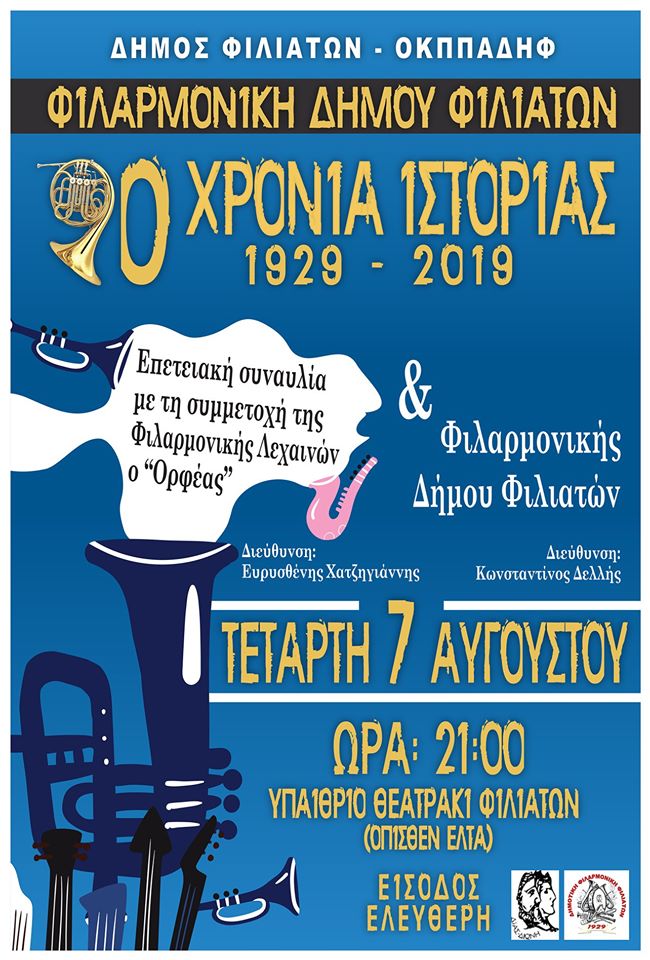 συμπληρώνει φέτος η «Δημοτική Φιλαρμονική Φιλιατών», μια Φιλαρμονική με κοινωνική και εκπαιδευτική υπόσταση που διαδραμάτισε και εξακολουθεί να διαδραματίζει σημαντικό ρόλο στα μουσικά δρώμενα της πόλεως των Φιλιατών και της ευρύτερης περιοχής της Θεσπρωτίας.Είναι η αρχαιοτερη Φιλαρμονική της Θεσπρωτίας η 4η αρχαιότερη της Ηπείρου και αποτελείται από 45 περίπου μουσικούς. Γιορτάζοντας φέτος τα 90 χρόνια της κάνει μια σειρά εκδηλώσεων, μεταξύ των οποίων και οι συναυλίες με τη Φιλαρμονική Λεχαινων. Οι δύο φιλαρμονικές θα παίξουν η καθεμία ξεχωριστά το δικό τους πρόγραμμα και στη συνέχεια θα ερμηνεύσουν και κάποια κομμάτια από κοινού.Για τη Φιλαρμονική των Λεχαινων αποτελεί τιμή και αναγνώριση η πρόσκληση αυτή, καθώς θα της δοθεί η ευκαιρία να αποτελέσει τον πολιτιστικό πρεσβευτή της πόλης και του Δήμου σε μια μακρινή και ηρωική περιοχή της χώρας μας. Δύο Φιλαρμονικες με παρόμοια ιστορία (η φιλαρμονική Λεχαινων συμπληρώνει φέτος 87 χρόνια ιστορίας) με προσφορά στον τόπο, με διακρίσεις,με δύο νέους μαέστρους με όρεξη που έχουν δημιουργήσει υπέροχα σύνολα και με δεκάδες νέους μουσικούς, παιδιά των σχολείων που εντυπωσιαζουν κάθε φορά με τις επιδόσεις τους, που αναμένεται να μαγέψουν το κοινό με τις εμφανίσεις τους στην ιστορική πόλη των Φιλιατών. Η φιλαρμονική Λεχαινων θα ταξιδεψει με 50 μουσικούς που θα δώσουν τον καλύτερο εαυτό τους για να δικαιολογησουν τη φήμη που τους συνοδεύει και με τη διεύθυνση του Ευρυσθενη Χατζηγιάννη θα αποδώσουν τα καλύτερα. Η Φιλαρμονική Λεχαινων ευχαριστεί για την πρόσκληση τον Δήμαρχο Φιλιατών κ. Παππα τον Αντιδήμαρχο κ. Μποροδημο και τον Αρχιμουσικό κ. Δελλη