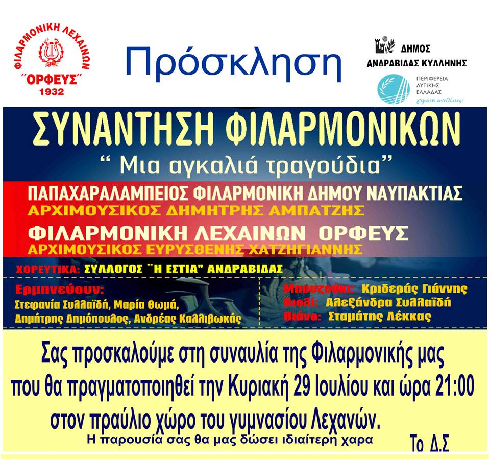 Ο σύλλογος φιλομουσων Λεχαινών “ΟΡΦΕΥΣ” μετά τις τελευταίες εξελίξεις και την τραγική κατάληξη των Φονικων πυρκαγιών στη χώρα μας, δείχνοντας την αμεριστη συμπαρασταση στις οικογένειες των θυμάτων και τους πληγέντες, παρακαλεί τους ακροατές που θα παρακολουθήσουν την συναυλία της φιλαρμονική την Κυριακή 29 Ιουλίου 2018 στο Γυμνάσιο Λεχαινών στις 21:00 αντί εισοδου( καθώς είναι ελεύθερη) να βοηθήσουν , προαιρετικα, στην προσπάθεια για την συγκέντρωση ειδών πρώτης αναγκης(γάζες, μπεταντιν, φυσιολογικό ορο, οδοντοβουρτσες, οδοντόκρεμες, πετσέτες, σεντόνια, αντικουνουπικα, φρούτο κρεμες, ξυραφάκια, σφουγγάρια κ. λ.π)fucidin αλοιφές ,