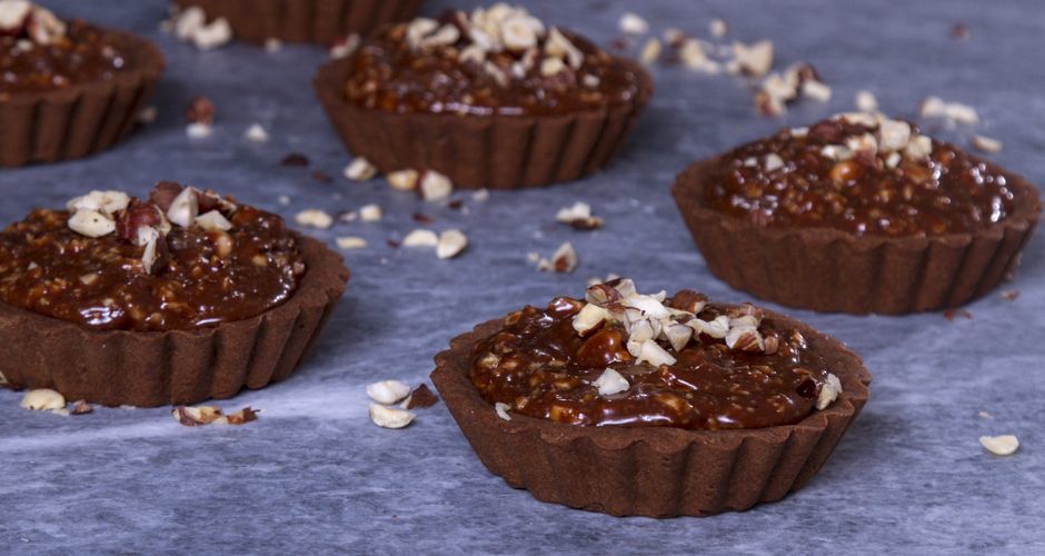 - Μοιράζουμε το μείγμα της καραμέλας μέσα στα ταρτάκια και γαρνίρουμε με έξτρα φουντούκια.