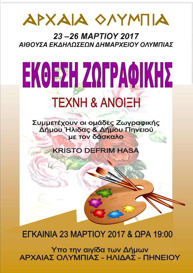 Ο Δήμος Αρχαίας Ολυμπίας σε συνεργασία με τους Δήμους Ηλιδας και Πηνείου διοργανώνει έκθεση ζωγραφικής με θέμα «Τέχνη και Άνοιξη» με έργα της ομάδας εικαστικών της Παπαχριστοπουλείου Βιβλιοθήκης Αμαλιάδας υπό τις οδηγίες του δασκάλου ζωγραφικής Kristo Defrim Hasa.