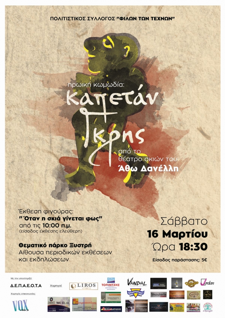 Το απόγευμα της ίδιας ημέρας και ώρα 18.30 ο γνωστός καραγκιοζοπαίχτης Άθως Δανέλλης θα παρουσιάσει την ηρωική κωμωδία, για μικρούς και μεγάλους, ”Ο Καπετάν Γκρής”. Είσοδος παράστασης 5 ευρώ.