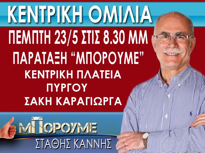 Την Πέμπτη 23 Μαΐου η κεντρική ομιλία του υποψήφιου Δημάρχου Στ.Καννή στην κεντρική πλατεία Πύργου