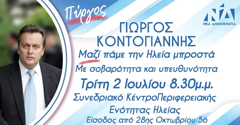 Την Τρίτη 2 Ιουλίου, θα πραγματοποιηθεί η κεντρική ομιλία του Γεώργιου Κοντογιάννη στον Πύργο, στο Συνεδριακό Κέντρο Περιφερειακής Ενότητας Ηλείας , στι 8:30 μ.μ. (είσοδος από την 28η Οκτωβρίου 56)