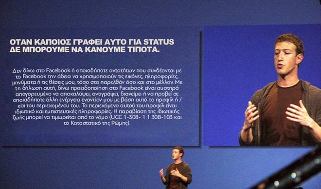 Ξαφνικά, ο ένας μετά τον άλλο διάφοροι Έλληνες χρήστες του Facebook άρχισαν να κοινοποιούν και να μοιράζονται ένα κείμενο – προκήρυξη προστασίας των προσωπικών τους δεδομένων που υποτίθεται πως τα προστατεύει από τον Ζούκερμπεργκ και την παρέα του, οι οποίοι, έχουν ούτως ή άλλως πλήρη πρόσβαση σε ΟΛΑ τα προσωπικά δεδομένα σου άπαξ και αποδεχθείς τους όρους χρήσης του FB όταν εγγράφεσαι.