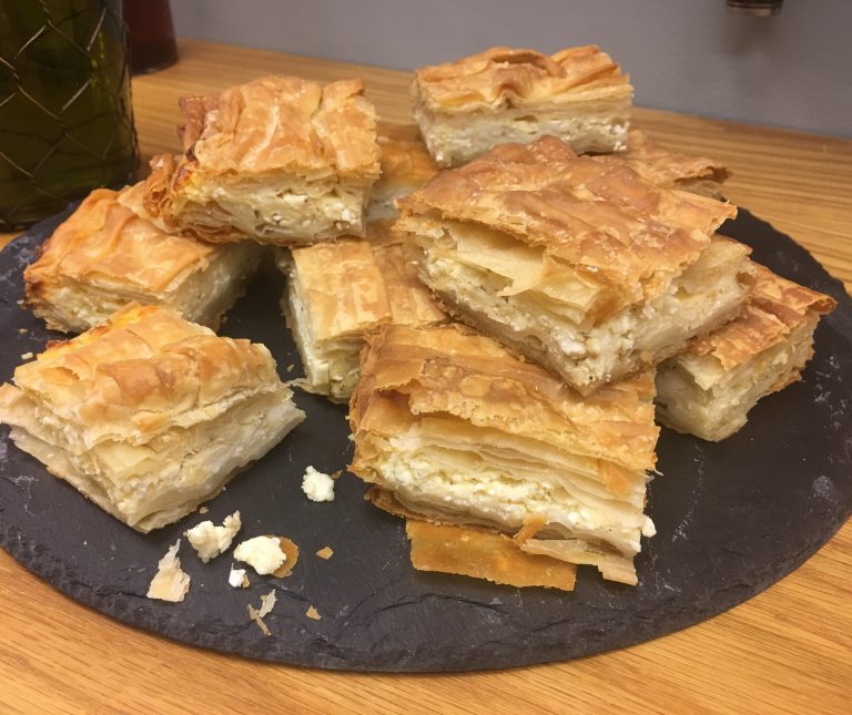 Ψήνουμε σε καλά προθερμασμένο φούρνο στους 180 βαθμούς C στον αέρα, στη μεσαία σχάρα, για περίπου 45 λεπτά να ροδίσει καλά το φύλλο.