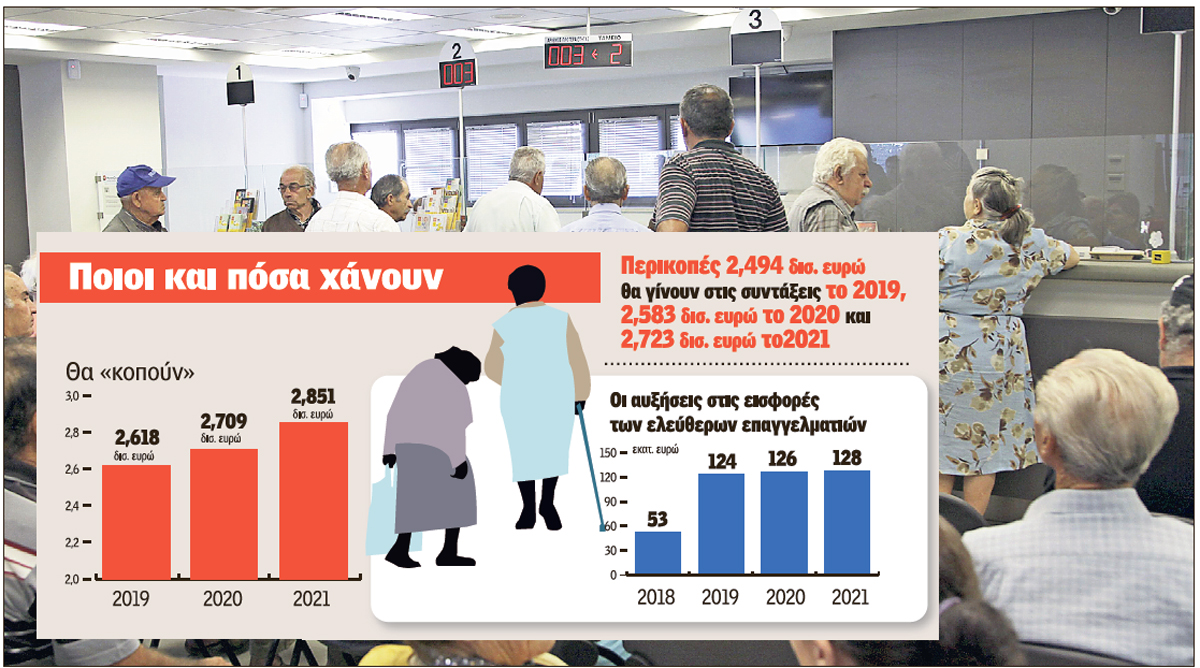 Σωρευτική απώλεια 8,178 δισ. ευρώ στα εισοδήματά τους θα έχουν από το 2019 έως το 2021 πάνω από 1 εκατ. συνταξιούχοι (7,8 δισ. ευρώ) και από το 2018 ? 2021 περίπου 450.000 ελεύθεροι επαγγελματίες (431 εκατ. ευρώ) από τις μειώσεις στις συντάξεις και τις αυξήσεις των εισφορών, αντίστοιχα, που επιβάλλει το συμπληρωματικό Μνημόνιο.