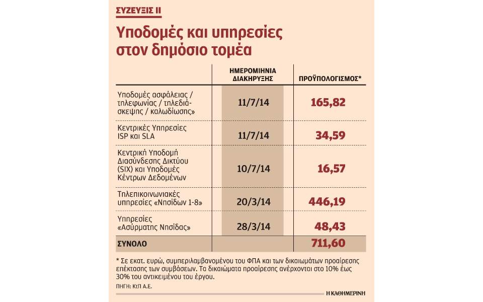 Πάντως, αυτά τα δύο υποέργα, συνολικού ύψους 500 εκατ. ευρώ για τέσσερα χρόνια, είχαν διεκδικήσει ο ΟΤΕ, η Cyta Hellas, η Wind και η Forthnet. Oι ίδιοι παραμένουν στο παιχνίδι και αναμένεται να διεκδικήσουν την παροχή των σχετικών υπηρεσιών.
