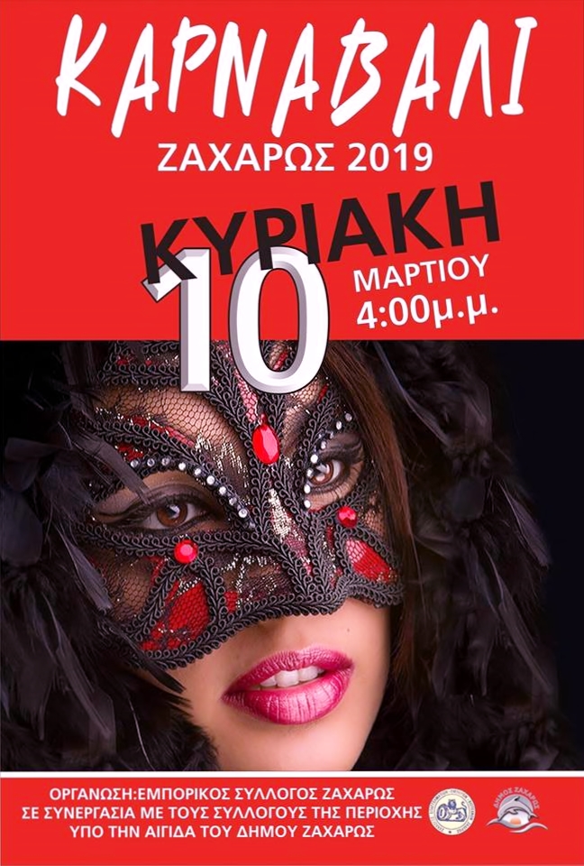 Οι εκδηλώσεις θα ξεκινήσουν την Παρασκευή 8 Μαρτίου 2019 και ώρα 7:00 με την Νυχτερινή Παρέλαση, το Σάββατο 9 Μαρτίου 2019 και ώρα 4:00 θα πραγματοποιηθεί ο Παιδικός χορός στην Κεντρική Πλατεία Ζαχάρως με ζογκλέρ, κλόουν και πολλές εκπλήξεις και θα ολοκληρωθούν την Κυριακή 10 Μαρτίου 2019 και ώρα 4:00 με την μεγάλη Καρναβαλική Παρέλαση ,ένα γιορτινό πολυθέαμα, διανθισμένο από τις αποκριάτικες παραδόσεις και τα έθιμα του λαού μας, από τα άρματα και τα group που θα έχουν επιμεληθεί οι συμμετέχοντες Σύλλογοι, σας υπόσχονται απεριόριστη διασκέδαση και ψυχαγωγία.
