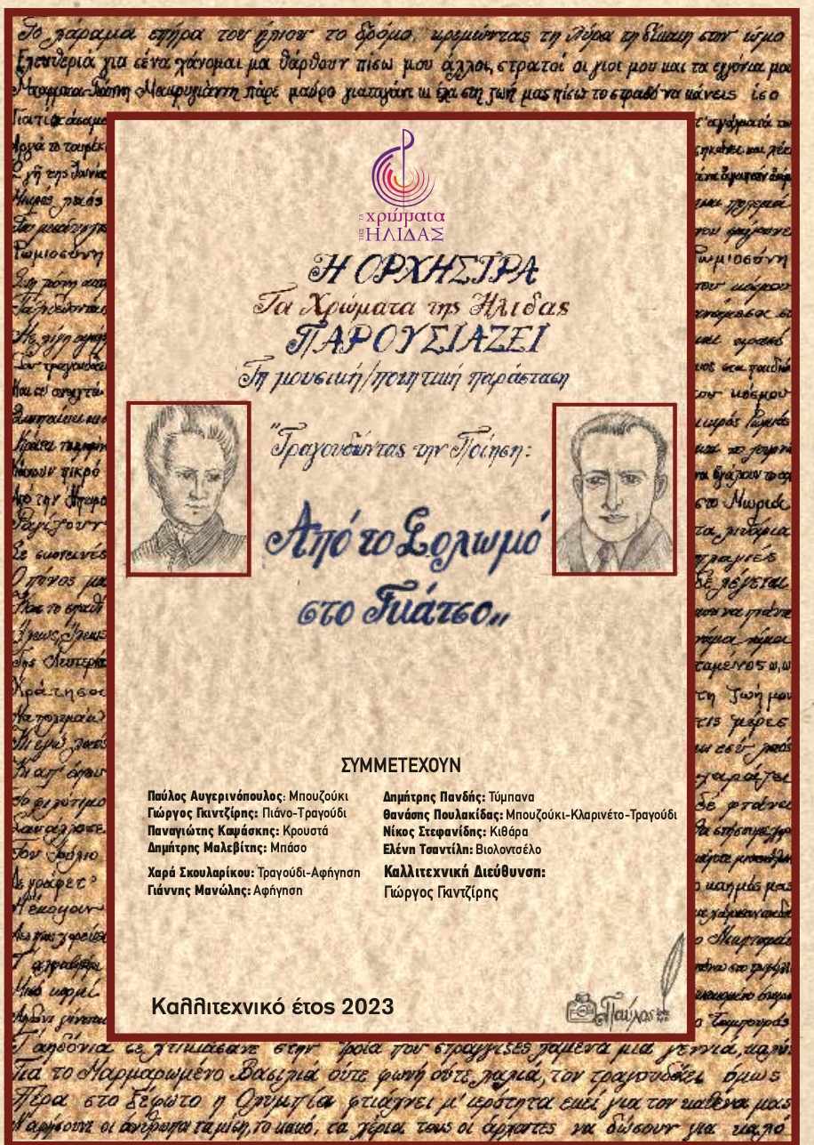 Από την «Προδομένη μου αγάπη», στη «Λευτεριά» και «Της αγάπης αίματα», μέχρι το «Η Σμύρνη μάνα καίγεται», «Να τανε το ’21», «Ο μαρμαρωμένος βασιλιάς» και «Μαλαματένια λόγια», η Ορχήστρα «Τα Χρώματα της Ήλιδας» θα ερμηνεύσει 23 συνολικά μελοποιημένα έργα, τα οποία είναι χαραγμένα στη μνήμη του κόσμου και μιλούν για τους αγώνες των Ελλήνων διαχρονικά.