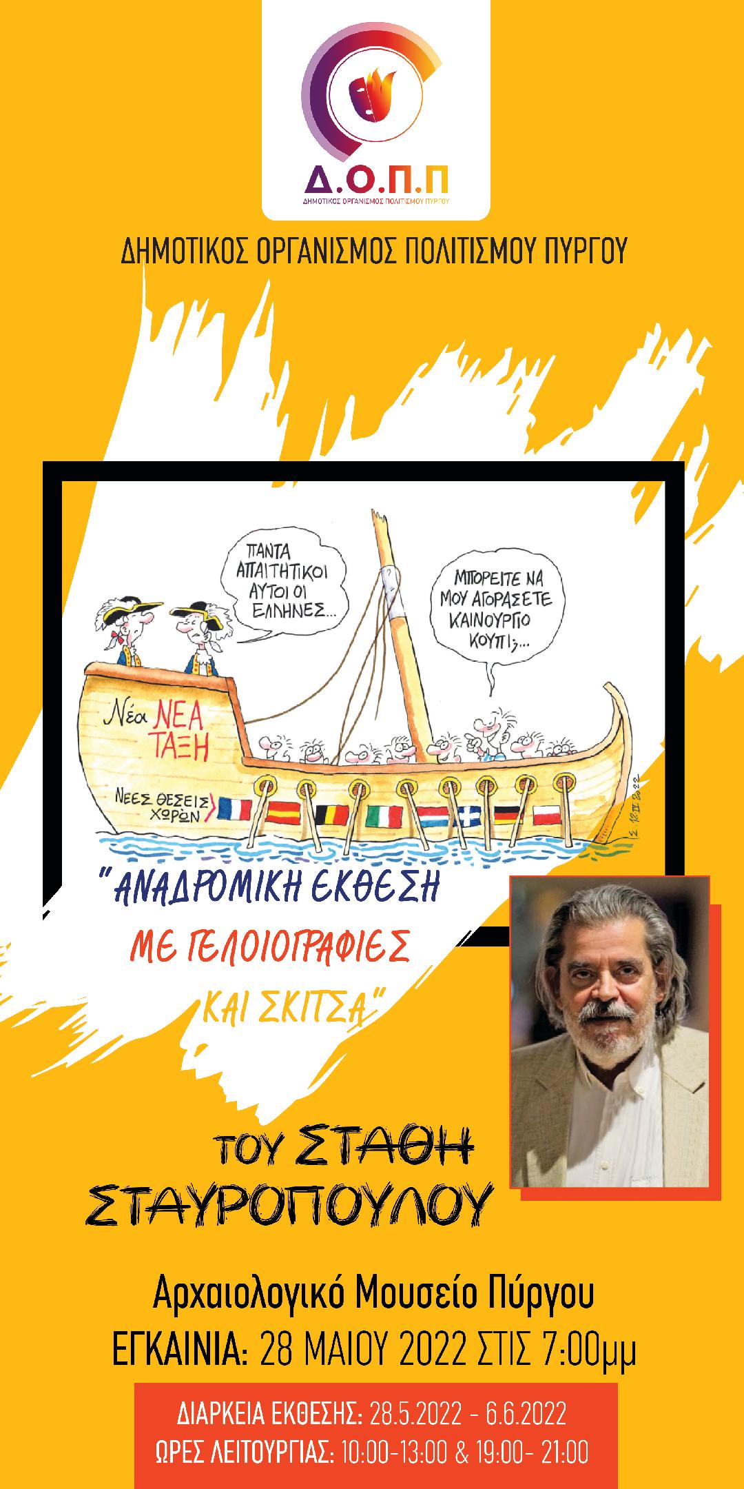 Τα έργα, ενός εκ των κορυφαίων σκιτσογράφων και ιδιαίτερα αγαπητό Ηλείο που έχει εδώ και πολλά χρόνια την ξεχωριστή δική του αιχμηρή θέση στα θέματα της επικαιρότητας μέσω των ΜΜΕ, του Στάθη Σταυρόπουλου, θα έχουν την ευκαιρία να δουν από κοντά οι κάτοικοι του Πύργου και του Νομού.