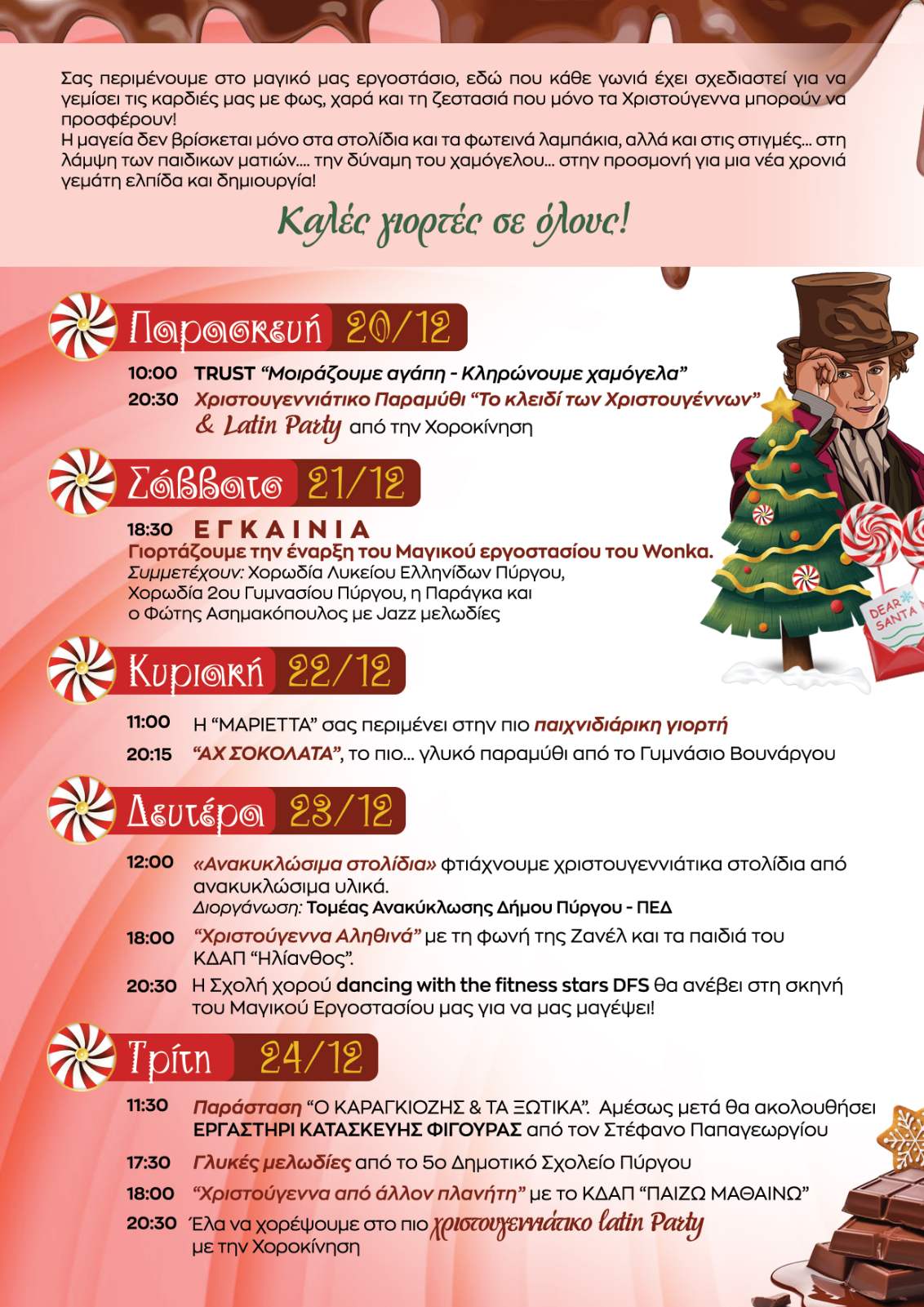 Την Χριστουγεννιάτικη ατμόσφαιρα που κυριαρχεί στην πόλη, έρχεται να ενισχύσει το “Μαγικό Εργοστάσιο του Wonka” με εκδηλώσεις, δημιουργικά εργαστήρια, παραμύθια, παιχνίδια και χορευτικά δρώμενα.