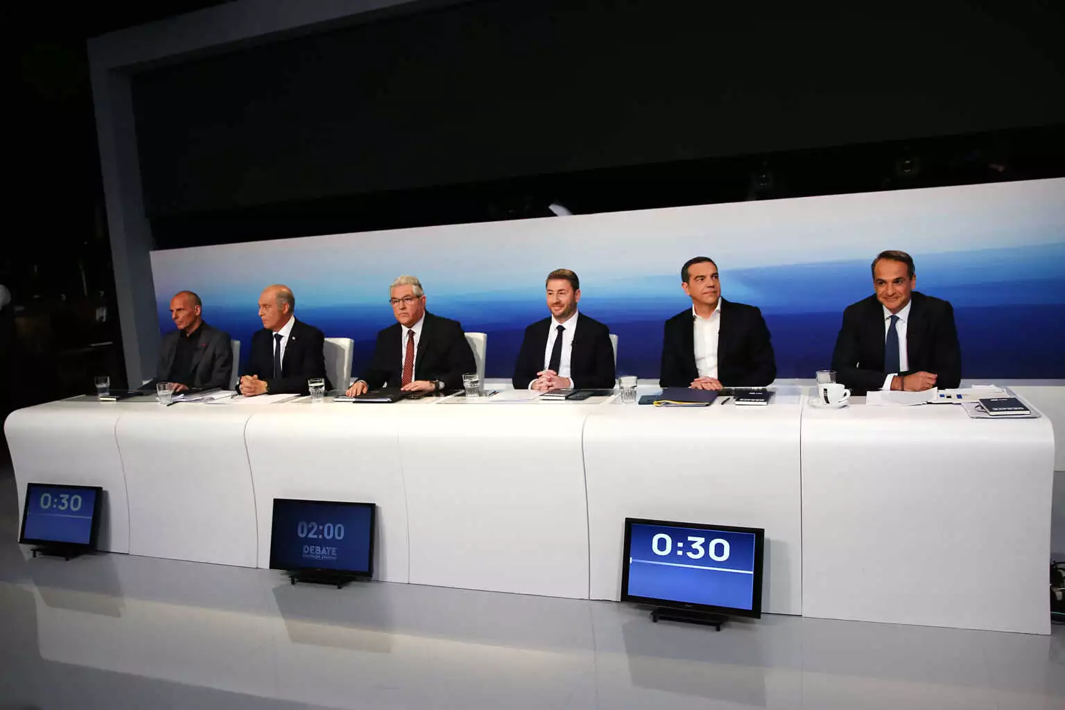 Μάρα Ζαχαρέα (STAR), Σία Κοσιώνη (ΣΚΑΪ), Γιώργος Παπαδάκης (ΑΝΤ1), Αντώνης Σρόιτερ (ALPHA), Παναγιώτης Στάθης (OPEN) και Ράνια Τζίμα (MEGA) βρέθηκαν ενώπιον του προέδρου της ΝΔ και πρωθυπουργού, Κυριάκου Μητσοτάκη, προέδρου του ΣΥΡΙΖΑ – Προοδευτική Συμμαχία, Αλέξη Τσίπρα, του προέδρου ΠΑΣΟΚ – ΚΙΝΑΛ, Νίκου Ανδρουλάκη, του Γ.Γ. της ΚΕ του ΚΚΕ, Δημήτρη Κουτσούμπα, του προέδρου της Ελληνικής Λύσης, Κυριάκου Βελόπουλου και του γραμματέα του ΜέΡΑ25, Γιάνη Βαρουφάκη.