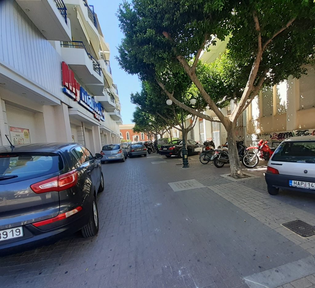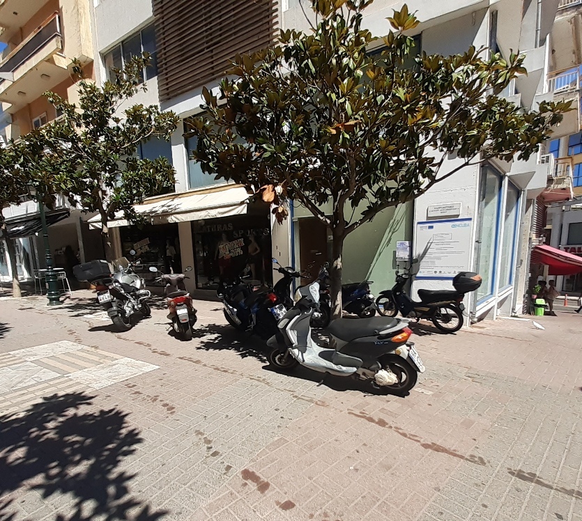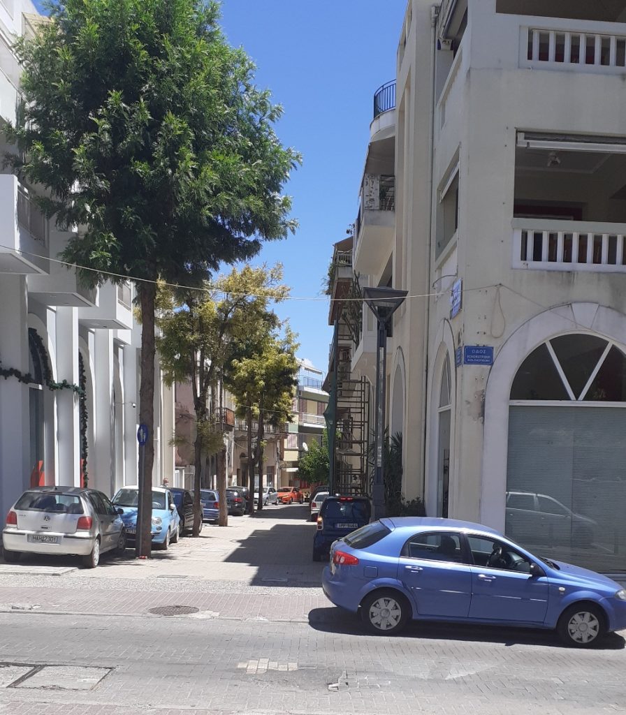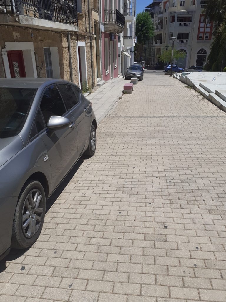 Ο πεζόδρομος από το Επαρχείο έως την παλιά Δημοτική Αγορά γεμάτη από σταθμευμένα (μερικά και σε παρκινγκ διαρκείας) αυτοκίνητα και μηχανάκια.