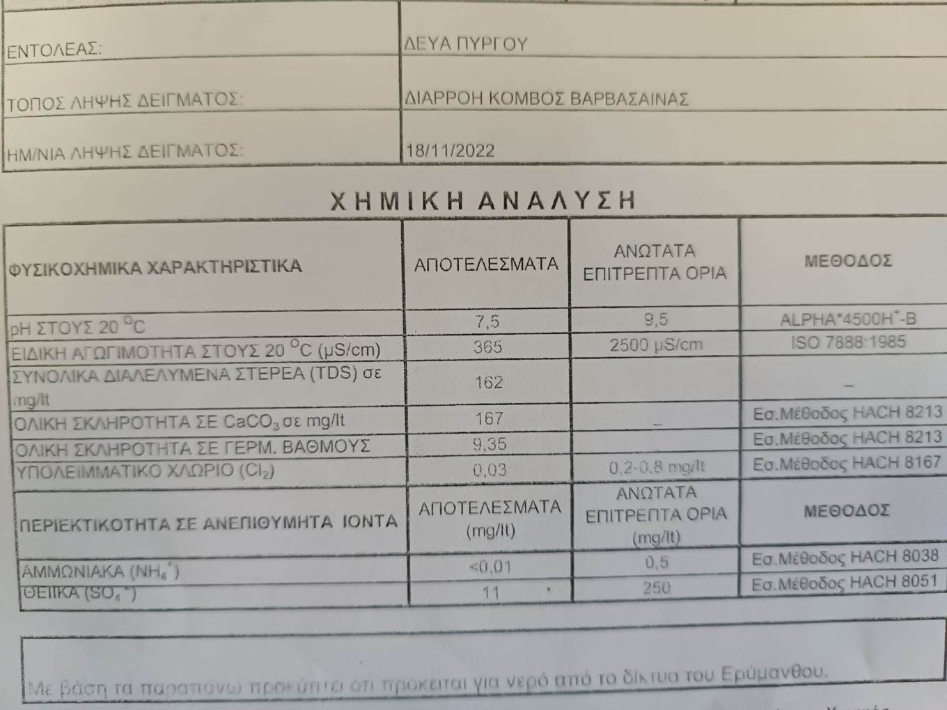 Η ΔΕΥΑΠ προέβη σε δειγματοληψία του νερού της υπάρχουσας διαρροής και από την ανάλυση που επισυνάπτουμε πρόκειται για νερό από το δίκτυο του Ερυμάνθου.