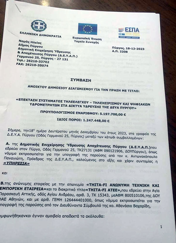 Υπεγράφη τη Δευτέρα (18/12) η σύμβαση με τον ανάδοχο για το μεγάλο έργο «Επέκταση συστήματος τηλεελέγχου – τηλεχειρισμού και Ψηφιακών υδρομετρητών στα δίκτυα ύδρευσης της ΔΕΥΑΠ».