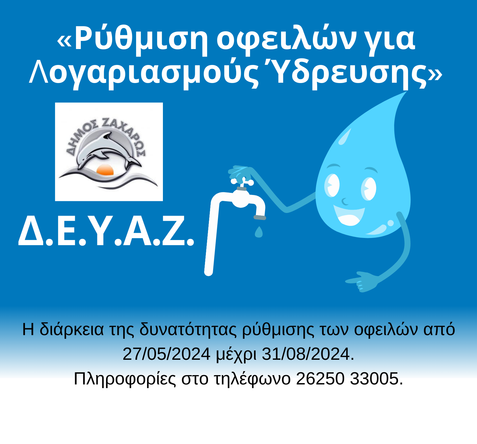 Με την υπ. αριθ. 63/2024 απόφαση της Δ.Ε.Υ.Α.Ζ. με θέμα «Ρύθμιση οφειλών από λογαριασμούς ύδρευσης» και ύστερα από την ενημέρωση και σύμφωνη γνώμη του Δημοτικού Συμβουλίου Ζαχάρως, αντιμετωπίζοντας με ιδιαίτερη ευαισθησία και κατανόηση τη δύσκολη οικονομική συγκυρία, την οποία διέρχονται όλα τα νοικοκυριά, η Δ.Ε.Υ.Α.Ζ. σας δίνει τη δυνατότητα ρύθμισης των ανεξόφλητων