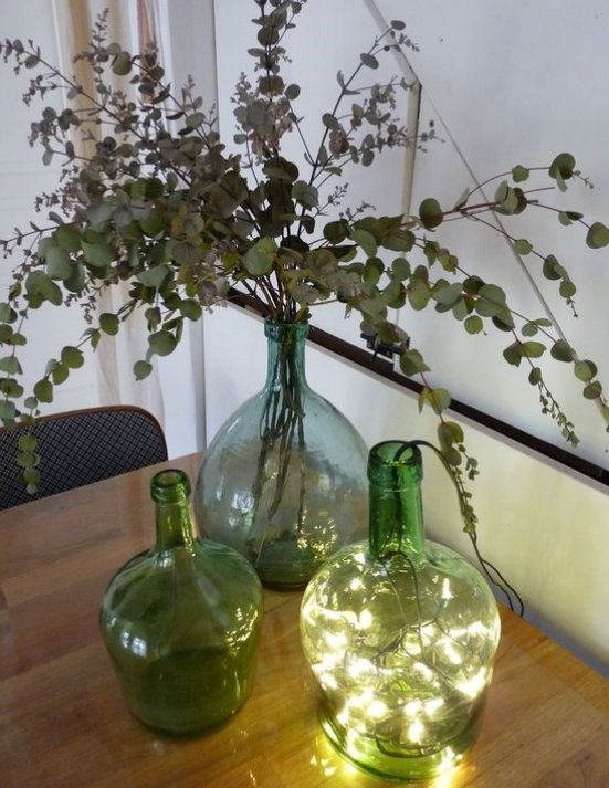 Ο φωτισμός τους με led ή η μετατροπή τους σε πολύ ξεχωριστά επιτραπέζια φωτιστικά είναι επίσης δύο ακόμη ιδιαίτεροι τρόποι για να αξιοποιήσετε διακοσμητικά τις μεγάλες γυάλινες μπουκάλες, προσθέτοντας στο σημείο που θα τις τοποθετήσετε μια vintage ή μοντέρνα διακοσμητική πινελιά, ανάλογα με το σχέδιο, την απόχρωσή τους και τα στοιχεία – αντικείμενα που θα τις πλαισιώσετε.