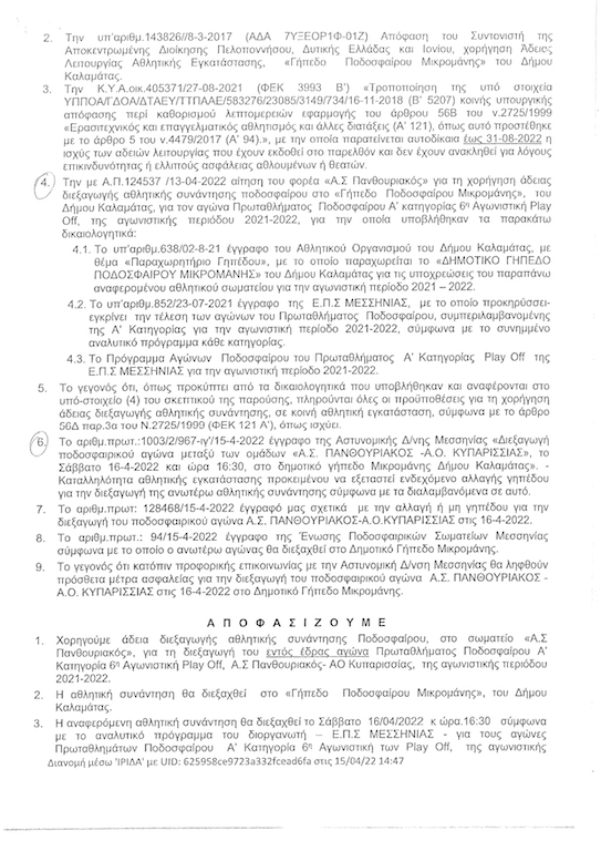 Επειδή από την πρώτη ήδη ματιά υπήρχαν βασιμότατες ενδείξεις ότι κάτι δεν …πήγαινε καλά με το έγγραφο αυτό, γιατί είχε εμφανείς διορθώσεις με …στυλό, τη Δευτέρα 30/5 αρχικά είχαν άμεση συνεργασία οι διοικούντες του Πανηλειακού με τον δήμαρχο Πύργου Παναγιώτη Αντωνακόπουλο, κι έπειτα έγινε κοινή επικοινωνία τόσο με τη Διεύθυνση Πολιτισμού κι Αθλητισμού της Περιφέρειας Πελοποννήσου όσο και με την αρμόδια διευθύντρια στην Π.Ε. Μεσσηνίας στην Καλαμάτα, ενώ το πρωί της Τρίτης όπως αρμοδίως είχε ζητηθεί κι εγγράφως, στάλθηκε το γνήσιο έγγραφο με τον συγκεκριμένο αριθμό πρωτοκόλλου. Το οποίο αποδεικνύεται πως είχε εκδοθεί στις 15 Απριλίου 2022 και ήταν για άλλον αγώνα, συγκεκριμένα τον αγώνα Πανθουριακός – ΑΟ Κυπαρισσίας στο γήπεδο Μικρομάνης, για το Σάββατο 16 Απριλίου 2022, στα πλαίσια του τοπικού πρωταθλήματος Μεσσηνίας! (Φωτό)