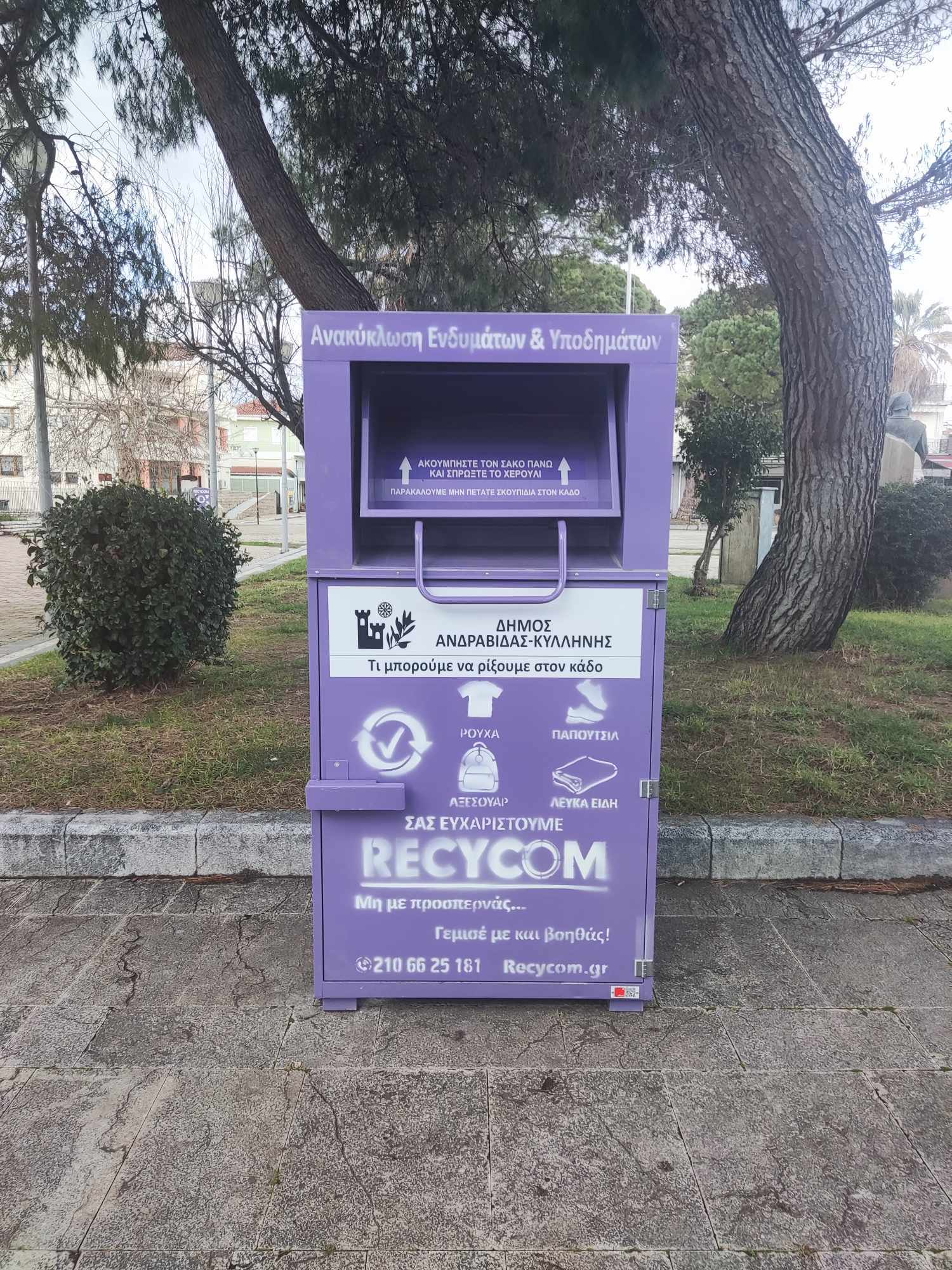 Δίκτυο μοβ κάδων για τη συγκέντρωση ρούχων, παπουτσιών και λευκών ειδών, τοποθετείται στον Δήμο Ανδραβίδας-Κυλλήνης. Συγκεκριμένα, ξεκίνησε ολοκληρώνεται άμεσα η τοποθέτηση των μοβ κάδων σε 23 σημεία του Δήμου. Με σύνθημα «Δώστε στα ρούχα σας μια νέα ζωή», ο Δήμος Ανδραβίδας-Κυλλήνης συμμετέχει στην εφαρμογή ενός ολοκληρωμένου συστήματος διαχείρισης κλωστοϋφαντουργικών (επανάχρηση- ανακύκλωση) δίνοντας έμφαση στη διαλογή στην