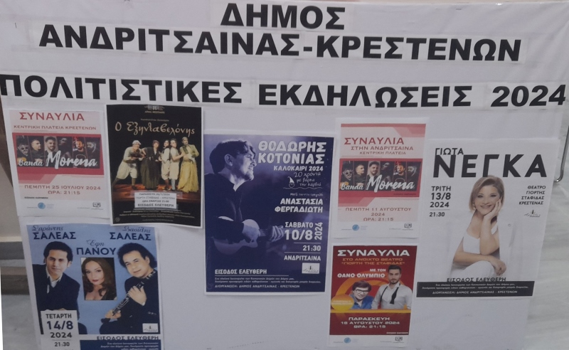 Με ονόματα πρώτης …γραμμής στο καλλιτεχνικό στερέωμα της χώρας μας, ο Δήμος Ανδρίτσαινας-Κρεστένων συνεχίζει και φέτος τον Αύγουστο την παράδοση για κορυφαίες πολιτιστικές εκδηλώσεις, προς τιμήν των δημοτών αλλά και χιλιάδων ετεροδημοτών και επισκεπτών.