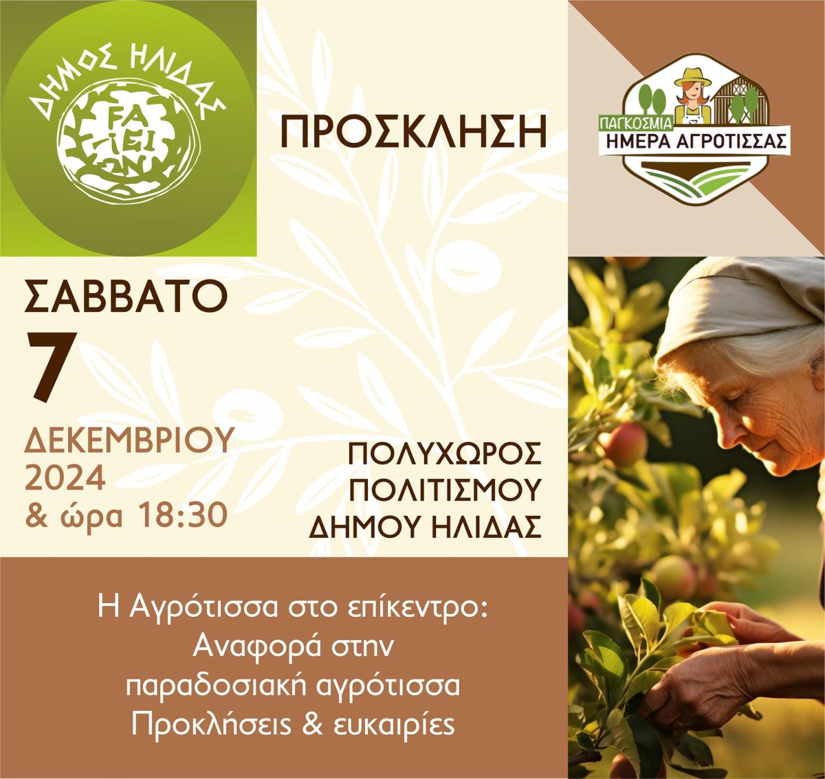 18:30, στον Πολυχώρο Πολιτισμού Δήμου Ήλιδας. Κεντρική ομιλήτρια θα είναι η συγγραφέας και δημοσιογράφος κα Ευγενία Κατούφα, με θέμα: «Η αγρότισσα του τώρα και του χθες», ενώ στην εκδήλωση θα παρουσιαστούν παραδοσιακοί χοροί και παραδοσιακά τραγούδια της υπαίθρου, με ειδική μνεία στη γυναίκα αγρότισσα.