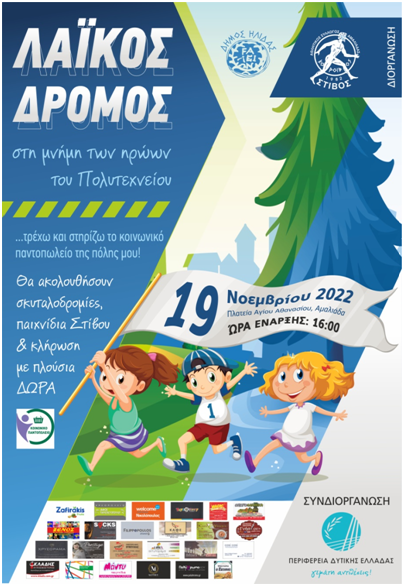 Συνεχίζονται οι δηλώσεις συμμετοχής στον Λαϊκό Δρόμο για το πολυτεχνείο που θα πραγματοποιηθεί το Σάββατο στις 19 Νοέμβριου 2022 στις 16:00 για μικρούς και μεγάλους στην πλατεία Αγίου Αθανασίου. Ο Αγώνας έχει και κοινωνικό χαραχτήρα αφού με πρωτοβουλία του Δήμου Ήλιδας θα γίνει συγκέντρωση τροφίμων για το Κοινωνικό Παντοπωλείο, σε ειδικό καλάθι που θα υπάρχει στην Πλατεία Αγίου Αθανασίου. Οι συμμετέχοντες την ημέρα του αγώνα και άλλοι ενδιαφερόμενοι θα μπορούν να φέρνουν στο σημείο συγκέντρωσης των τροφίμων ότι επιθυμούν, ώστε να προσφέρουν για τις οικογένειες που ζουν στα όρια της φτώχειας μια στήριξη για τις δύσκολες μέρες που βιώνουν και ένα χαμόγελο για τις γιορτές των Χριστουγέννων που πλησιάζουν.