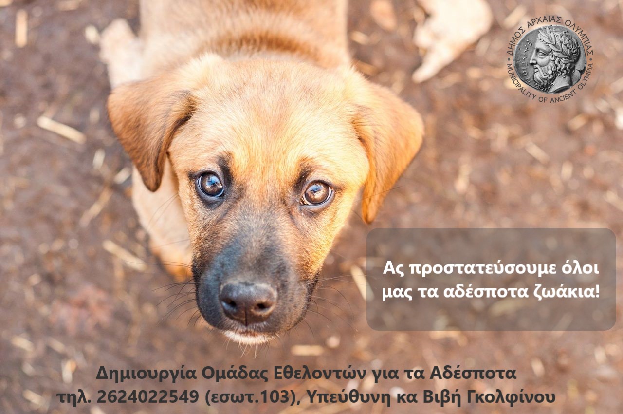 Στη δημιουργία ομάδας εθελοντικής δράσης για την προστασία των αδέσποτων ζώων προχωρά ο Δήμος Αρχαίας Ολυμπίας, απευθύνοντας ανοικτή πρόσκληση σε όλους τους πολίτες, οι οποίοι