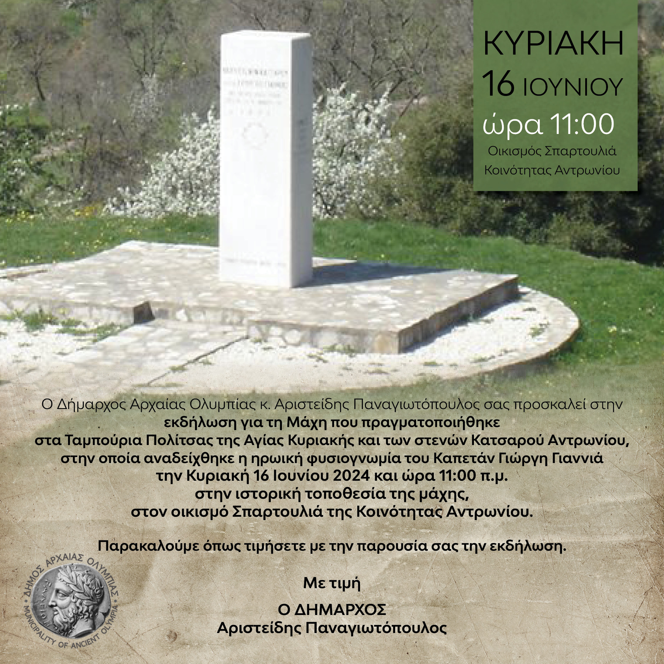 Ο Δήμαρχος Αρχαίας Ολυμπίας κ. Αριστείδης Παναγιωτόπουλος σας προσκαλεί στην εκδήλωση για τη Μάχη που πραγματοποιήθηκε στα Ταμπούρια Πολίτσας της Αγίας Κυριακής και των στενών Κατσαρού Αντρωνίου, στην οποία αναδείχθηκε η ηρωική φυσιογνωμία του Καπετάν Γιώργη Γιαννιά την Κυριακή 16 Ιουνίου 2024 και ώρα 11:00πμ στην ιστορική τοποθεσία της μάχης, στον οικισμό Σπαρτουλιά της Κοινότητας Αντρωνίου.