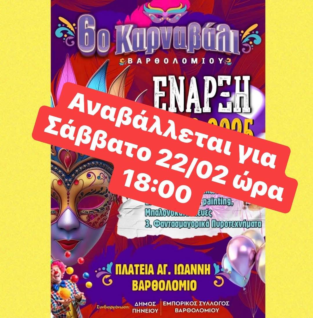“Ο Δήμος Πηνειού ενημερώνει άπαντες τους καρναβαλιστές ότι οι αποκριάτικες εκδηλώσεις του Σαββατοκύριακου – 15 & 16 Φεβρουαρίου – αναβάλλονται λόγω της πρόγνωσης για δυσμενή καιρικά φαινόμενα.