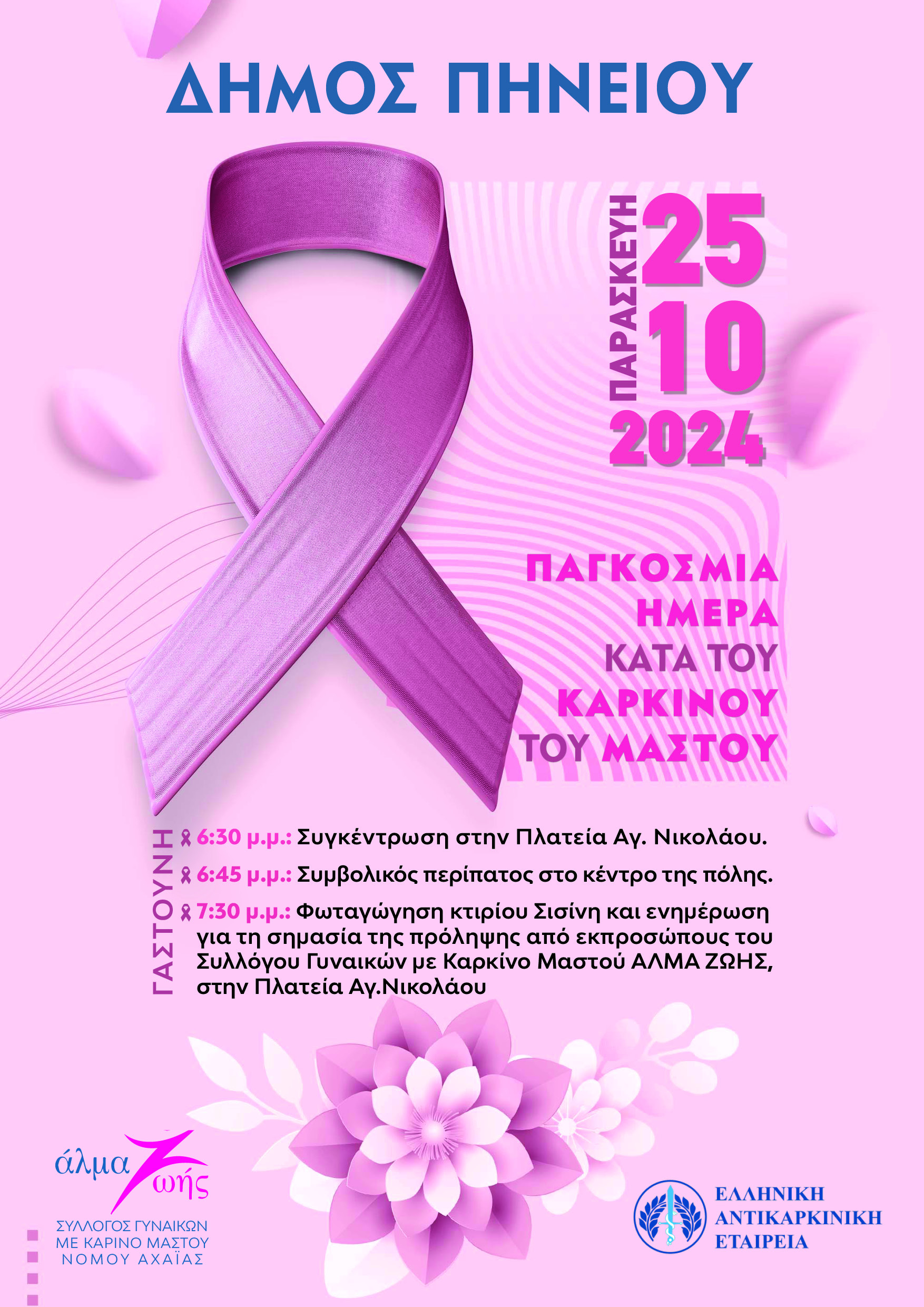 Ο Δήμος Πηνειού σε συνεργασία με τον Πανελλήνιο Σύλλογο Γυναικών με Καρκίνο Μαστού «Άλμα Ζωής», την Ελληνική Αντικαρκινική Εταιρεία και το Κέντρο Υγείας Γαστούνης συμμετέχει, το απόγευμα της Παρασκευής, στις δράσεις ευαισθητοποίησης. Με σημείο συγκέντρωσης την πλατεία Αγίου Νικολάου (6:30 μ.μ.), το ροζ ποτάμι της ελπίδας αναμένεται να πλημμυρίσει τα πεζοδρόμια της πόλης με τους συμμετέχοντες διανείμουν ενημερωτικό υλικό για τη σημασία της πρόληψης.
