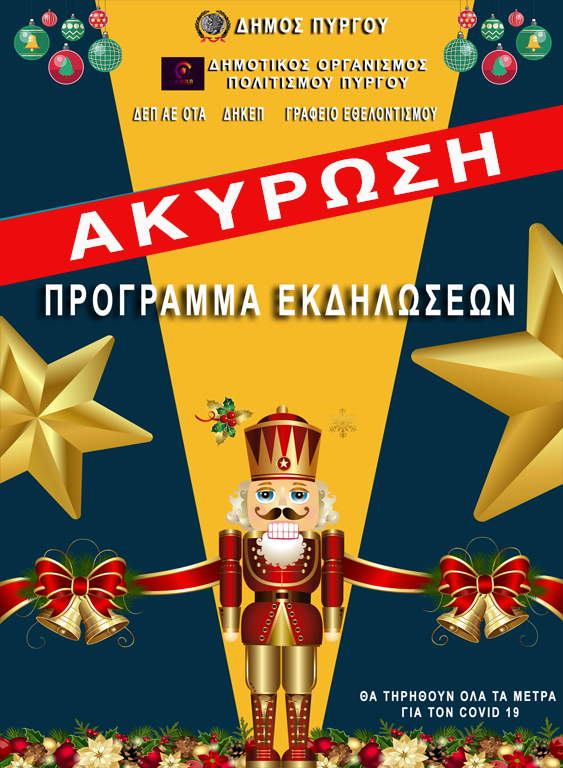 “Έπειτα από την ανακοίνωση των νέων μέτρων κατά του covid 19 από το Υπουργείο Υγείας και των λοιπών αρμόδιων αρχών του κράτους, με αίσθημα ευθύνης απέναντι στους πολίτες του δήμου Πύργου και την διασφάλιση της δημόσιας υγείας αποφασίστηκε η ακύρωση όλων των εκδηλώσεων τόσο στο Μαγικό Εργοστάσιο στο Πάρκο Ξυστρή, στις Κοινότητες του Δήμου Πύργου, Επιτάλιο, Βούναργο και Καράτουλα καθώς και στο Δημοτικό Θέατρο Απόλλων.