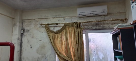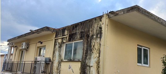 Στο κτίριο έχουν διαπιστωθεί βλάβες από κατερχόμενη υγρασία από την ταράτσα, ιδιαίτερα στον όροφο, στις εσωτερικές και εξωτερικές τοιχοποιίες, με εξαιρετικά μεγάλη παρουσία μούχλας και αποσάθρωσης του σκυροδέματος με διείσδυση χλωριόντων.