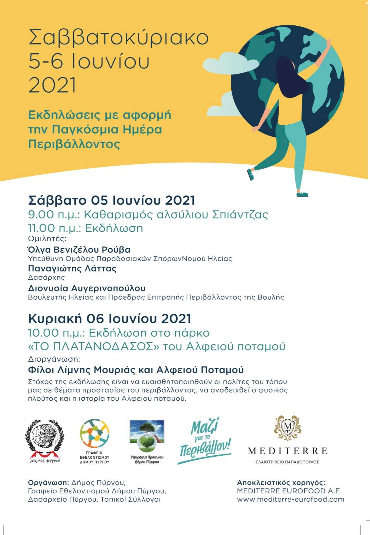 Με αφορμή την Παγκόσμια Ημέρα Περιβάλλοντος ο Δήμος Πύργου διοργανώνει διήμερο δράσεων το Σαββατοκύριακο (5 και 6 Ιουνίου) στο Αλσύλλιο της Σπιάντζας και στο Πάρκο του Αλφειού. Σε συνεργασία με το Γραφείο Εθελοντισμού, το Δασαρχείο Πύργου, την Υπηρεσία Πρασίνου και δεκάδες συλλόγους, ο Δήμος Πύργου θα στείλει το πιο ηχηρό και διαδραστικό μήνυμα όχι μόνο για την ημέρα, αλλά για μια ευρύτερη αλλαγή στάση ζωής και συμπεριφοράς προς το περιβάλλον που μας αφορά όλους. Σημαντική θα είναι για μια ακόμη φορά η συμβολή της εταιρείας «Mediterre Ελαιουργείο Παπαδόπουλος» που είναι ο μεγάλος χορηγός σε όλες τις δράσεις καθαρισμού του Δήμου Πύργου.