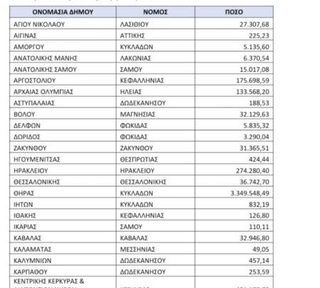 Τα ποσά αποδίδονται στους δικαιούχους Δήμους με χρηματική εντολή του Υπουργείου Εσωτερικών προς το Ταμείο Παρακαταθηκών και Δανείων.