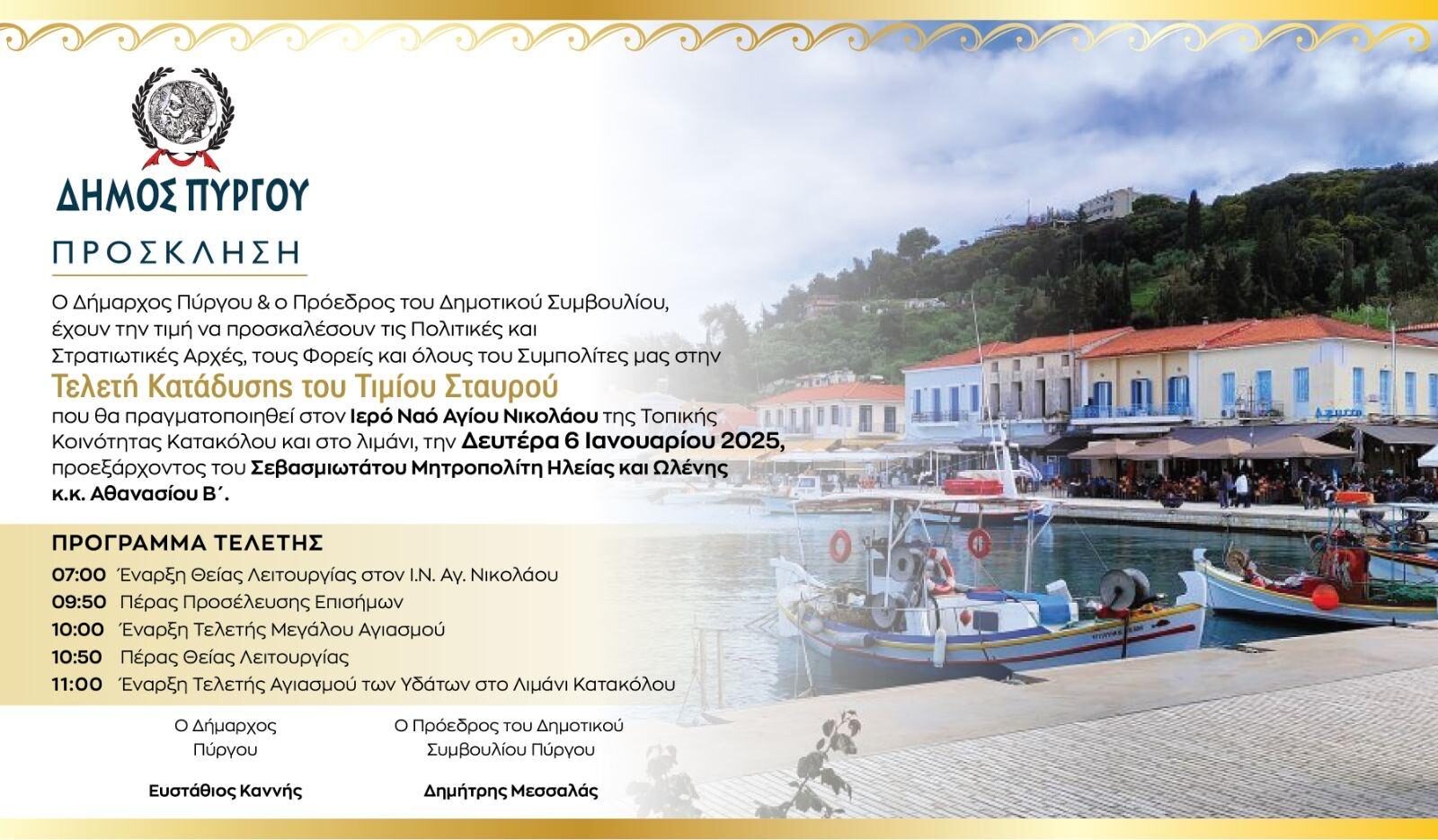 Προσκαλούνται οι Πολιτικές και Στρατιωτικές Αρχές, οι Φορείς, και όλοι οι Συμπολίτες, στην Τελετή Κατάδυσης του Τιμίου Σταυρού που θα πραγματοποιηθεί στον Ιερό Ναό Αγίου Νικολάου της Τοπικής Κοινότητας Κατακόλου και στο λιμάνι, προεξάρχοντος του Σεβασμιοτάτου Μητροπολίτη Ηλείας και Ωλένης κ.κ. Αθανασίου Β’.