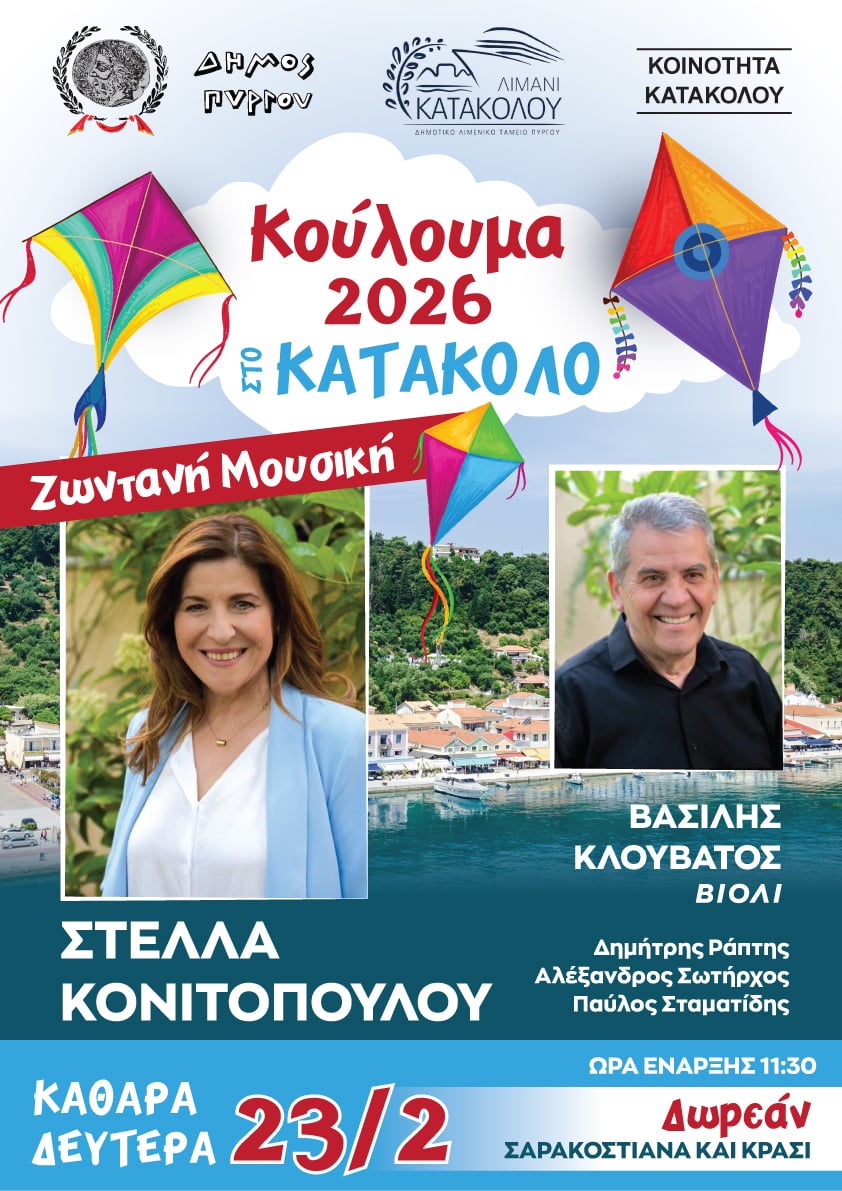 Τη Δευτέρα 23 Φεβρουαρίου, το ραντεβού δίνεται στο πανέμορφο Κατάκολο, στις 11.30 π.μ., όπου θα εορταστούν τα παραδοσιακά Κούλουμα, σε μια γιορτή γεμάτη κέφι, χορό και νηστίσιμα εδέσματα.