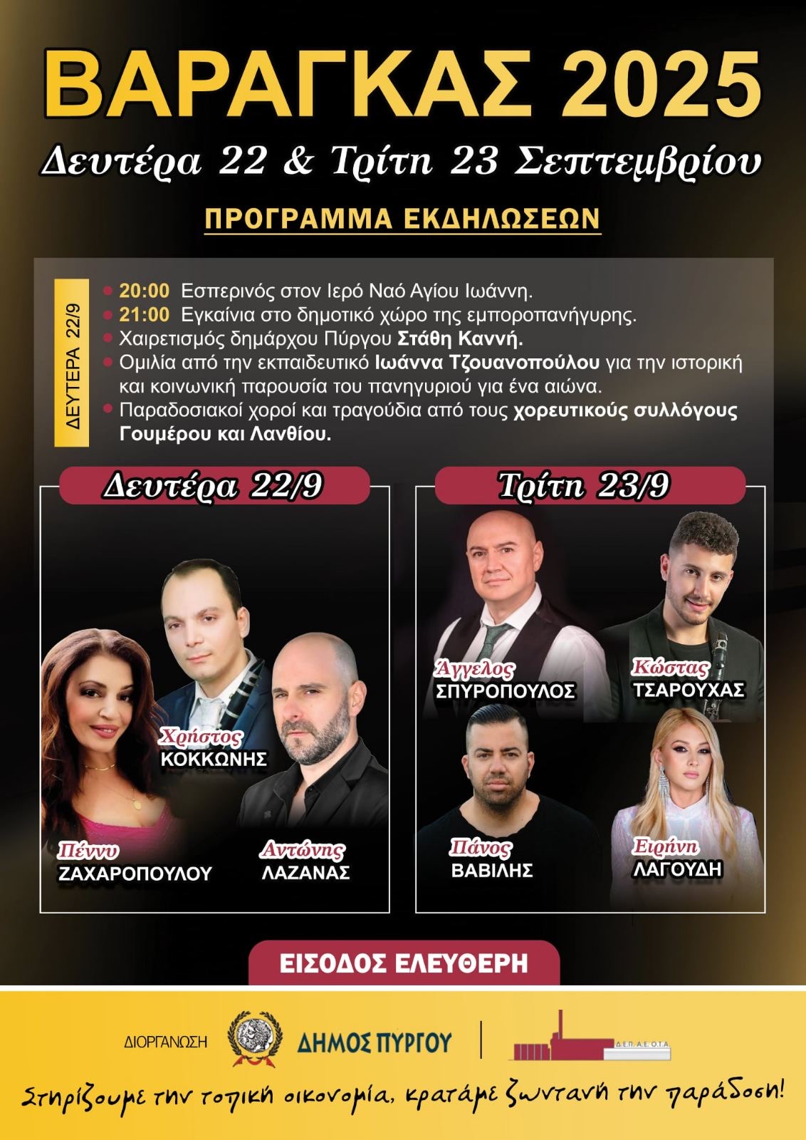 Ο Δήμος Πύργου και η Δημοτική Επιχείρηση Πύργου ΑΕ ΟΤΑ, διοργανώνουν και φέτος την εμποροπανήγυρη ΒΑΡΑΓΚΑ, που θα πραγματοποιηθεί τη Δευτέρα 22 Σεπτεμβρίου και την Τρίτη 23 Σεπτεμβρίου.