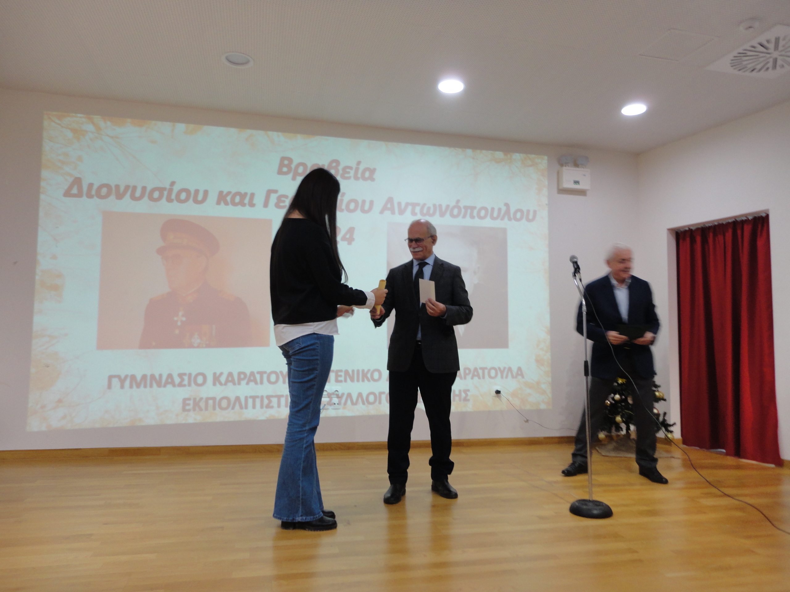 Μέσα σε μία συγκινησιακά φορτισμένη ατμόσφαιρα πραγματοποιήθηκε στην αίθουσα εκδηλώσεων του σχολικού συγκροτήματος Γυμνασίου-Λυκείου Καράτουλα, το πρωί της Παρασκευής, 22 Νοεμβρίου 2024, η απονομή των βραβείων «Διονυσίου και Γεωργίου Αντωνόπουλου» στους αριστεύσαντες μαθητές από τη Δημοτική Ενότητα Ωλένης.